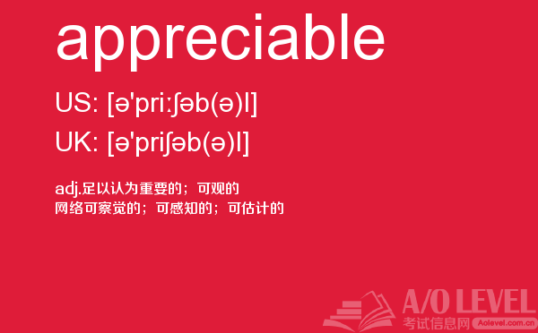 现在申请英国院校的中国孩子非常多,几乎每一个学生都在为一种叫做英国a-level的考试而努力着。a/o-level考试网老师为大家解析a-level考试重难点单词appreciable,大家认真学习,会有帮助。如果您想了解alevel辅导班,alevel学校什么时候招生,新加坡读a水准,alevel有什么好学校等关于a-level考试的相关资讯,请继续浏览并关注课窝a/o-level考试网。