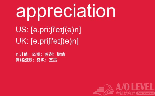 英国留学考试a-level考试考什么?a-level考试题型一定要注意积累和总结。课窝a/o-level考试网小编每天会给大家带来a-level考试的相关资讯,今天带来a-level单词appreciation的解析,希望大家认真的积累a-level考试词汇。如果您想了解alevel在线学习,alevel考试难度,了解alevel辅导,alevel国际高中等关于a-level考试的相关资讯,请继续浏览并关注课窝a/o-level考试网。