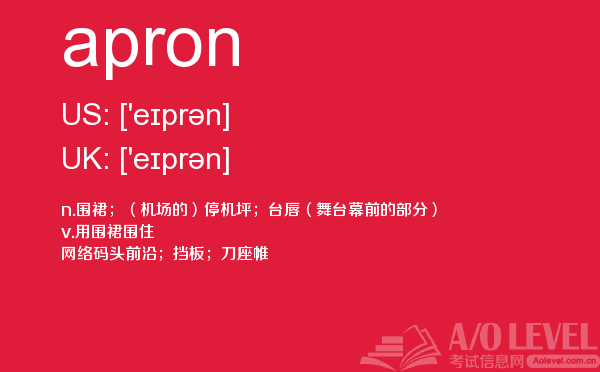 目前,a/olevel逐渐为人所熟知,很多学生都会主动了解alevel考试流程。同时也会抱怨a-level英语题比较难,任务重。那现在我们就放松一下,跟着a/o-level考试网小编来看看a-level考试中要积累的单词apron,认真的学习积累。如果您想了解alevel词汇量测试,alevel课程设置,alevel考试在中国,alevel数学评分标准等关于a-level考试的相关资讯,请继续浏览并关注课窝a/o-level考试网。
