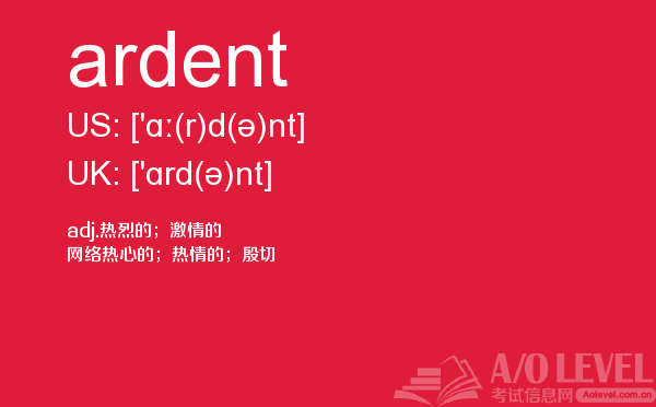 英国留学对于留学成绩的比拼越来越激烈,申请英国院校留学的一大指标a-level考试分数要求也水涨船高.虽然成绩只是申请的一部分,但不得不说,好看的英国a-level成绩是学生是否优秀的证据。放松一下跟着a/o-level考试网来学习一下a-level考试词汇ardent的应用。如果您想了解英国高中alevel排名,alevel国际高中,alevel学费一般多少,alevel会计学等关于a-level考试的相关资讯,请继续浏览并关注课窝a/o-level考试网。