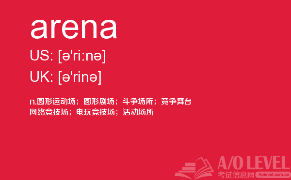 英国留学考试a-level考试考什么?a-level考试题型一定要注意积累和总结。课窝a/o-level考试网小编每天会给大家带来a-level考试的相关资讯,今天带来a-level单词arena的解析,希望大家认真的积累a-level考试词汇。如果您想了解alevel夏令营,alevel考试的考生年龄上限是多少,alevel中国,alevel答案网站等关于a-level考试的相关资讯,请继续浏览并关注课窝a/o-level考试网。