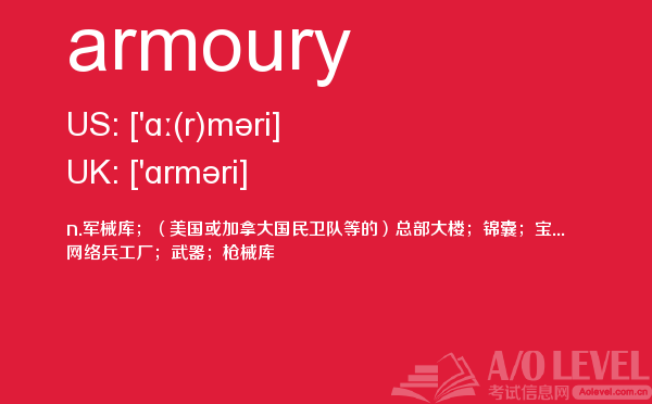 英国a-level考试报名费很好解决,那怎样才能达到a-level考试词汇量要求呢?别再纠结于a-level考试分数要求了,今天我们来一起看看a/o-level考试网今天带给你的a-level单词armoury的讲解。如果您想了解alevel考试价格,alevel经济知识点,爱德思alevel2017真题,a水准一年等关于a-level考试的相关资讯,请继续浏览并关注课窝a/o-level考试网。