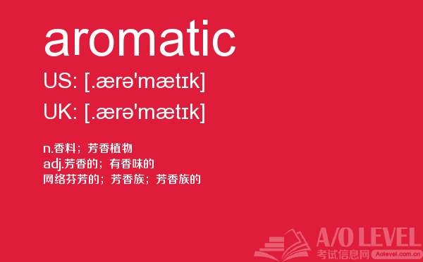 对于a-level考试,我们一再强调要加强a-level考试真题实战,多做英国a-level考试真题。放松一下,跟着a/o-level考试网来积累一下a-level考试中你会用到的单词aromatic,对你的a-level考试会有很大的帮助。如果您想了解alevel生物难度,英国alevel排名,alevel考试考点,申请英国alevel高中等关于a-level考试的相关资讯,请继续浏览并关注课窝a/o-level考试网。
