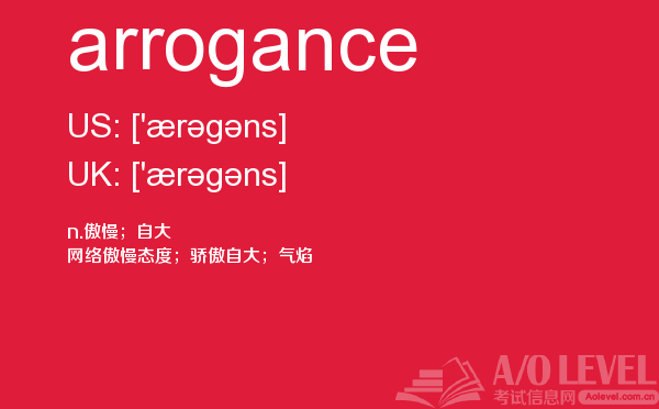随著学生的素质提升,各大a-level课程培训班的师资和英国a-level题库也不断的完善,近年来学生考出来a-level分数也不断上涨。但是去英国留学,对英国留学资讯和英国的a-level考试资讯都是需要了解的,下面一起跟着a/o-level考试网来看看a-level词汇之arrogance的详细介绍。如果您想了解在线alevel辅导,alevel时间,alevel写作,alevel化学知识点等关于a-level考试的相关资讯,请继续浏览并关注课窝a/o-level考试网。