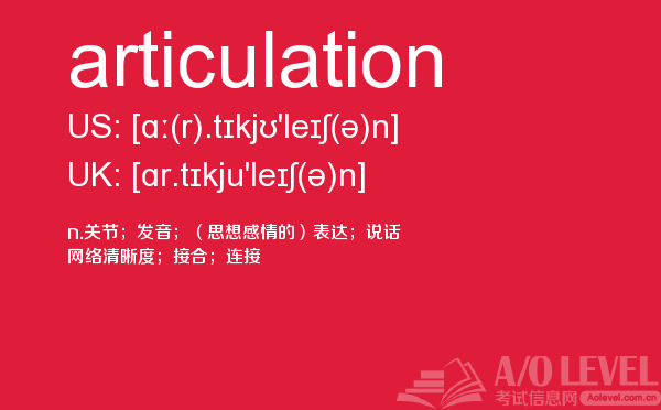 a- level课程一般在中国开设数学、进阶数学(或称高等数学)、物理、计算机学、会计学、商业学、经济学等课程供学生选择。那么关于alevel考生应该选哪些alevel课程呢?以后会给大家详细介绍,今天a/o-level考试网主要给大家全面介绍a-level词汇中的articulation单词。如果您想了解alevel生物,alevel考试报名时间,考alevel多少钱,alevel阅读技巧等关于a-level考试的相关资讯,请继续浏览并关注课窝a/o-level考试网。