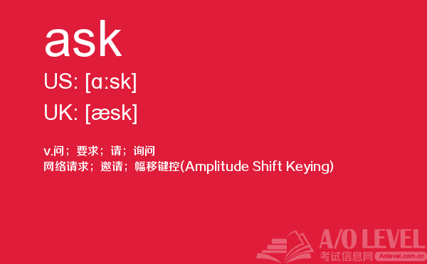 课窝a/o-level考试网上提供了许多信息可以供考生们参考,比如考生需要在此网站报名,打印准考证,或者搜寻与英国a-level考试内容相关的资料等等。考生如果想在短时间内,迅速掌握a-level考试资讯,就需要合理运用此网站的信息。今天带来的是a-level考试词汇之ask的详细介绍。如果您想了解alevel法律,alevel数学考试大纲,alevel课程多久,alevel中文书目等关于a-level考试的相关资讯,请继续浏览并关注课窝a/o-level考试网。