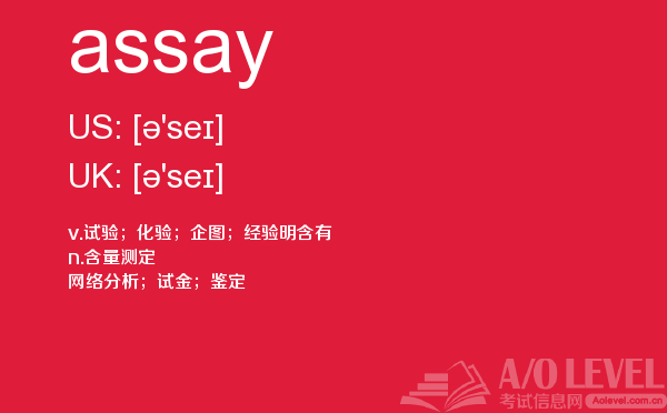 英国a-level入学考试的机会真的很少,每年就5-6月和10-11月两场考试。所以千万别因为不必要的原因,影响了a-level入学考试。为了让大家更好的在英国留学,a/o-level考试网会为大家带来a-level考试相关的资讯,一起来看看a/o-level考试网今天带来的词汇assay的解析。如果您想了解新加坡大学alevel,新加坡a水准考试试题,上海alevel中心,alevel考试时间费用等关于a-level考试的相关资讯,请继续浏览并关注课窝a/o-level考试网。