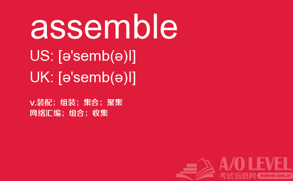 a-level的成绩分为a、b、c、d、e、u六个等级,a为最优,e为通过,u为不及格。如果学生对某门课的成绩不满意,可以选择重考,最终成绩以最好的一次为准。那么a-level考试想要取得a-level高分大家需要做到哪些呢?a/o-level考试网给大家带来的很多a-level考试经验,alevel考试技巧等等,想要考好a-level考试,不仅要知道这些,对于关于a-level考试的所有资讯都需要了解,最重点的是a-level词汇量的积累,今天a/o-level考试网就给大家带来的a-level的考试单词assemble的全面解析。如果您想了解alevel香港中文大学,上海alevel培训班,中国alevel考点,alevel中文书目等关于a-level考试的相关资讯,请继续浏览并关注课窝a/o-level考试网。