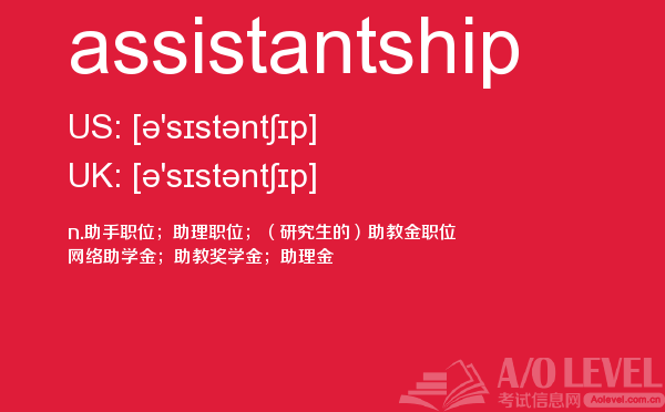 英国a-level考试是英国留学生去英国留学需要参加的考试,很多考生担心a-level考试分数要求高,英国a-level考试难度大,别担心,只要认真的学习a-level考试内容,小编相信大家一定能够考得a-level高分。今天a/o-level考试网给大家带来单词assistantship的全面解析。如果您想了解交大alevel学费,新加坡a水准考试在哪考,中国alevel1月份考试,olevel和alevel的区别等关于a-level考试的相关资讯,请继续浏览并关注课窝a/o-level考试网。
