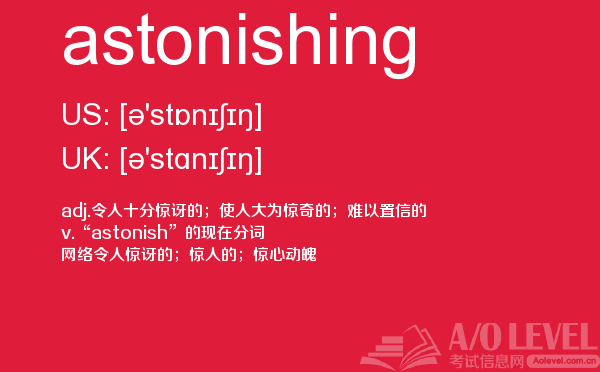 为了有a-level考试高分,很多童靴都参加英国高中课程a-level考试前都会做很多a-level考试真题。a-level考试备考要有一定的方法,课窝a/o-level考试网每天都会给大家带来a-level考试资讯,a-level考试备考相关的内容,今天课窝a/o-level考试网小编给大家带来关于a-level单词astonishing的详细介绍。如果您想了解上海alevel培训学校,澳大利亚alevel,alevel报名截止日期,爱德思alevel考试时间等关于a-level考试的相关资讯,请继续浏览并关注课窝a/o-level考试网。
