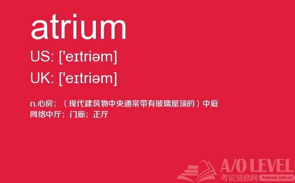 在a-level备考的过程中,想要冲刺到a-level写作的高分,相信大家都应该会知道,除了需要掌握a-level写作的一些技巧之外,优化文章中的词汇和句型也是冲刺高分的关键所在。也就是说,只有充分掌握了语法知识,才能让我们的的文章更为丰富形象。除了a-level写作,在a-level其他方面同学们也需要了解,下面课窝a/o-level考试网小编给大家带来a-level单词atrium的介绍。如果您想了解一年读完alevel,alevel数学和ap数学,alevel成绩网上查询,alevel考试网上报名等关于a-level考试的相关资讯,请继续浏览并关注课窝a/o-level考试网。