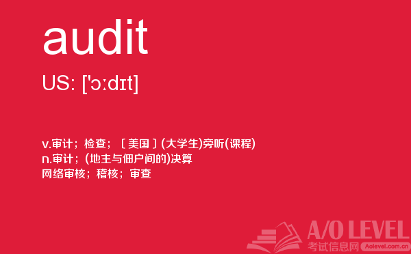 a-level 的考试将由所属的考试委员会分别于每年5-6月和10-11月在全球统一组织,成绩分别在8月和次年2月公布。关于a-level考试时间的具体内容,alevel考试网前面详细介绍过,大家可以查找alevel考试网前面的a-level考试资讯,alevel考试网每天会更新大量的alevel考试资讯,本篇要给大家介绍a-level单词audit的全面介绍。如果您想了解alevel香港中文大学,上海alevel培训班,中国alevel考点,alevel中文书目等关于a-level考试的相关资讯,请继续浏览并关注课窝a/o-level考试网。