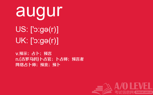 英国a-level入学考试的机会真的很少,每年就5-6月和10-11月两场考试。所以千万别因为不必要的原因,影响了a-level入学考试。为了让大家更好的在英国留学,a/o-level考试网会为大家带来a-level考试相关的资讯,一起来看看a/o-level考试网今天带来的词汇augur的解析。如果您想了解新加坡大学alevel,新加坡a水准考试试题,上海alevel中心,alevel考试时间费用等关于a-level考试的相关资讯,请继续浏览并关注课窝a/o-level考试网。