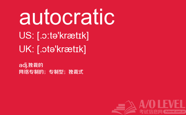 在a-level备考的过程中,想要冲刺到a-level写作的高分,相信大家都应该会知道,除了需要掌握a-level写作的一些技巧之外,优化文章中的词汇和句型也是冲刺高分的关键所在。也就是说,只有充分掌握了语法知识,才能让我们的的文章更为丰富形象。除了a-level写作,在a-level其他方面同学们也需要了解,下面课窝a/o-level考试网小编给大家带来a-level单词autocratic的介绍。如果您想了解alevel考试的考生年龄上限是多少,alevel国际学校,alevel剑桥,alevel物理讲义等关于a-level考试的相关资讯,请继续浏览并关注课窝a/o-level考试网。