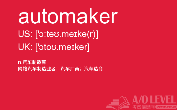 英国a-level学校,从教学质量上来看私立学校更占优势,大部分中国留学生也选择私立学校来读,不过一般都是提前一年来申请学校。中国目前也有20几所a-level学校,每年也同样有走进剑桥牛津等世界顶级大学的学生。所以在国外和在国内都可以选择a-level学校来学习。在前面关于a-level选校的问题已经详细介绍过,那么今天a/o-level考试网小编主要想介绍的是a-level重难点词汇automaker。希望对大家有帮助。如果您想了解alevel国际学校,alevel数学有几本书,英国alevel成绩只有c,alevel考试成绩等关于a-level考试的相关资讯,请继续浏览并关注课窝a/o-level考试网。