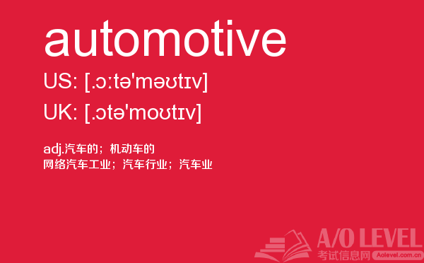 英国高中课程(a-level)的学制为两年:第一年称为as水准,学生通常选择自己最擅长且最有兴趣的3—4门课,通过考试后获得as证书。第二年称为a2水准,学生可选择as水准中优秀的3门课继续学习,通过考试后获得a-level证书。关于a-level学制相信大家肯定有一定的了解,今天alevel考试网想要带大家了解的并不是a-level学制的问题,想要介绍的是a-level重难点单词automotive,希望对大家有帮助。如果您想了解alevel经济essay,alevel成绩有效期,alevel进阶数学分数段,什么是alevel课程等关于a-level考试的相关资讯,请继续浏览并关注课窝a/o-level考试网。