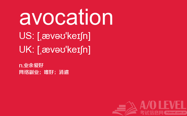英国留学对于留学成绩的比拼越来越激烈,申请英国院校留学的一大指标a-level考试分数要求也水涨船高.虽然成绩只是申请的一部分,但不得不说,好看的英国a-level成绩是学生是否优秀的证据。放松一下跟着a/o-level考试网来学习一下a-level考试词汇avocation的应用。如果您想了解alevel考试机经,alevel真题试卷,alevel都有什么课程,alevel课程多久等关于a-level考试的相关资讯,请继续浏览并关注课窝a/o-level考试网。