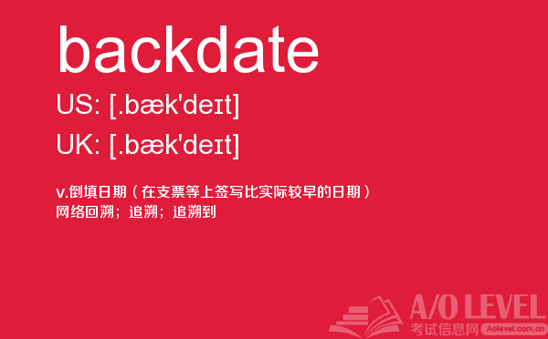 英国高中课程(a-level)的学制为两年:第一年称为as水准,学生通常选择自己最擅长且最有兴趣的3—4门课,通过考试后获得as证书。第二年称为a2水准,学生可选择as水准中优秀的3门课继续学习,通过考试后获得a-level证书。关于a-level学制相信大家肯定有一定的了解,今天alevel考试网想要带大家了解的并不是a-level学制的问题,想要介绍的是a-level重难点单词backdate,希望对大家有帮助。如果您想了解alevel会计真题答案,alevel物理词汇,alevel报名网站,alevel难不难等关于a-level考试的相关资讯,请继续浏览并关注课窝a/o-level考试网。