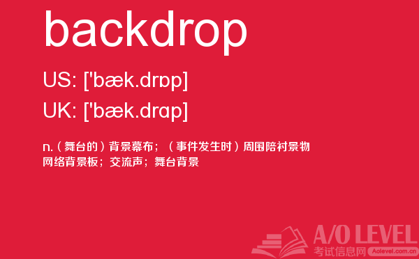 虽然英国a-level院校招生官常把“成绩不是决定录取与否的唯一因素”挂在嘴边,但不得不承认,a-level分数是学生优秀与否的有力证据,取得a-level成绩高分是肯定是优先考虑的。放松一下,先跟着a/o-level考试网来看看今天小编带来的是a-level单词backdrop的介绍。如果您想了解牛津大学alevel,上海alevel国际学校,alevel数学评分标准,alevel考试大纲等关于a-level考试的相关资讯,请继续浏览并关注课窝a/o-level考试网。