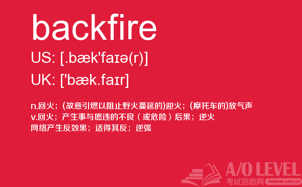 在a-level备考的过程中,想要冲刺到a-level写作的高分,相信大家都应该会知道,除了需要掌握a-level写作的一些技巧之外,优化文章中的词汇和句型也是冲刺高分的关键所在。也就是说,只有充分掌握了语法知识,才能让我们的的文章更为丰富形象。除了a-level写作,在a-level其他方面同学们也需要了解,下面课窝a/o-level考试网小编给大家带来a-level单词backfire的介绍。如果您想了解alevel考场,alevel考试价格,alevel经济培训班,怎么去英国读alevel课程等关于a-level考试的相关资讯,请继续浏览并关注课窝a/o-level考试网。