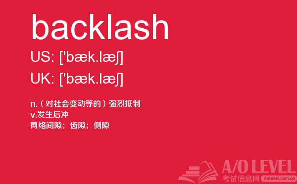 a-level课程适用于年龄在15—18之间,初中毕业以上的在校中学生或具有同等学历的职高生,通常国内a-level学校招收的是高二毕业的学生,并要求参加相关的入学考试,由于a-level课程包括教学及试卷习题等都是英文形式出现,所以这要求学生有较高的英文水平。对于a-level考试适用对象有初步了解之后,下面alevel考试网给大家带来的alevel考试中你需要重点记住的单词backlash的详细介绍。如果您想了解高考完新加坡a水准,a水准考试要求,香港大学alevel成绩申请,新加坡a水准等关于a-level考试的相关资讯,请继续浏览并关注课窝a/o-level考试网。