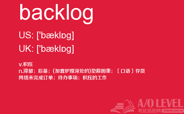 对于a-level考试,我们一再强调要加强a-level考试真题实战,多做英国a-level考试真题。放松一下,跟着a/o-level考试网来积累一下a-level考试中你会用到的单词backlog,对你的a-level考试会有很大的帮助。如果您想了解alevel物理实验,alevel化学教材电子版,alevel考试时刻,新加坡o水准a1多少分等关于a-level考试的相关资讯,请继续浏览并关注课窝a/o-level考试网。