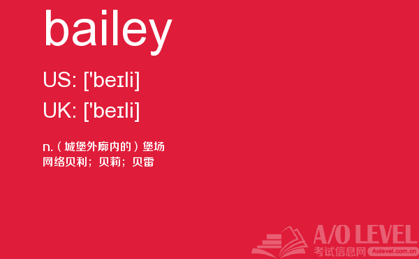 众多周知的英国a-level入学考试是进入英国院校的必经之路,所以我们自然不能小看,建议同学们能够加强a-level考试真题的练习,提前明确英国a-level考试报名的具体信息。为了提高考生们的英国a-level考试成绩,a/o-level考试网小编会每天给大家更新a-level留学资讯和alevel考试资讯,今天带来的是关于a-level考试词汇的单词全解,下面带你学习bailey的用法。如果您想了解剑桥alevel课程费用,alevel真题,新加坡a水准预科学院,alevel物理知识点等关于a-level考试的相关资讯,请继续浏览并关注课窝a/o-level考试网。