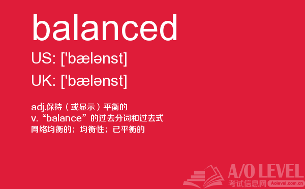 英国a-level入学考试的机会真的很少,每年就5-6月和10-11月两场考试。所以千万别因为不必要的原因,影响了a-level入学考试。为了让大家更好的在英国留学,a/o-level考试网会为大家带来a-level考试相关的资讯,一起来看看a/o-level考试网今天带来的词汇balanced的解析。如果您想了解澳大利亚alevel,alevel物理难吗,在线alevel培训,alevel报名网站等关于a-level考试的相关资讯,请继续浏览并关注课窝a/o-level考试网。