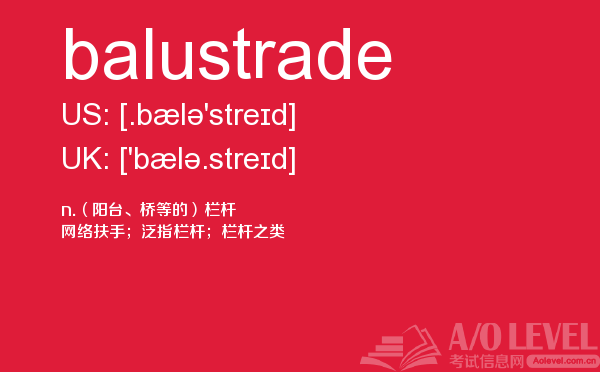 英国以其高质量的教学闻名于世,如果你还在思考a-level考试值不值得考?近几年的英国留学a-level考试的热潮足以证明一切!课窝a/o-level考试网会给大家带来a-level考试真题,a-level考试如何复习?等所有有关的a-level考试资讯。课窝a/o-level考试网今天带来a-level考试中很重要的单词balustrade的详细解析,会对你有帮助。如果您想了解alevel课程的适用范围,alevel国际学校,alevel考试日期,alevel经济学教材目录等关于a-level考试的相关资讯,请继续浏览并关注课窝a/o-level考试网。