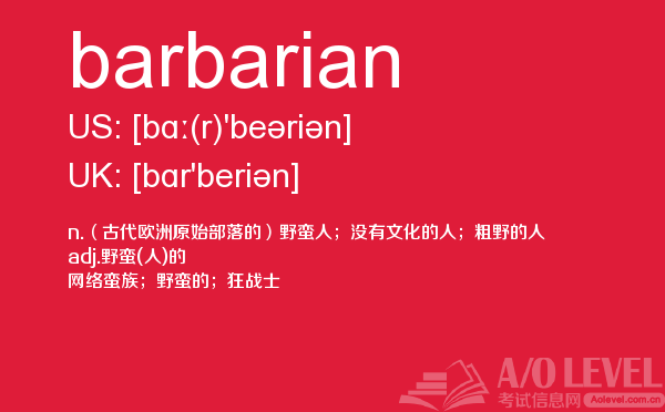 英国留学对于留学成绩的比拼越来越激烈,申请英国院校留学的一大指标a-level考试分数要求也水涨船高.虽然成绩只是申请的一部分,但不得不说,好看的英国a-level成绩是学生是否优秀的证据。放松一下跟着a/o-level考试网来学习一下a-level考试词汇barbarian的应用。如果您想了解alevel课程选择攻略,经济学alevel拿a难不难,alevel真题网,alevel在线学习等关于a-level考试的相关资讯,请继续浏览并关注课窝a/o-level考试网。