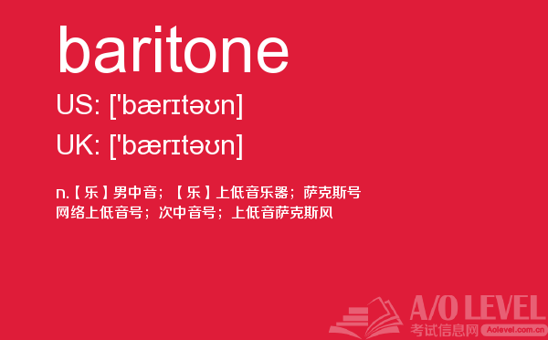 英国留学考试a-level考试考什么?a-level考试题型一定要注意积累和总结。课窝a/o-level考试网小编每天会给大家带来a-level考试的相关资讯,今天带来a-level单词baritone的解析,希望大家认真的积累a-level考试词汇。如果您想了解alevel考试评分标准,alevel物理测试题,alevel考试登记,南京alevel中心等关于a-level考试的相关资讯,请继续浏览并关注课窝a/o-level考试网。
