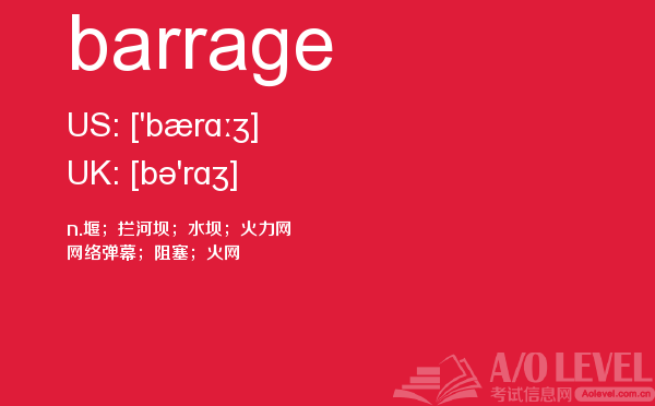 众多周知的英国a-level入学考试是进入英国院校的必经之路,所以我们自然不能小看,建议同学们能够加强a-level考试真题的练习,提前明确英国a-level考试报名的具体信息。为了提高考生们的英国a-level考试成绩,a/o-level考试网小编会每天给大家更新a-level留学资讯和alevel考试资讯,今天带来的是关于a-level考试词汇的单词全解,下面带你学习barrage的用法。如果您想了解新加坡a水准优势,alevel评分标准,alevel化学还原氧化知识点,alevel考试备考等关于a-level考试的相关资讯,请继续浏览并关注课窝a/o-level考试网。