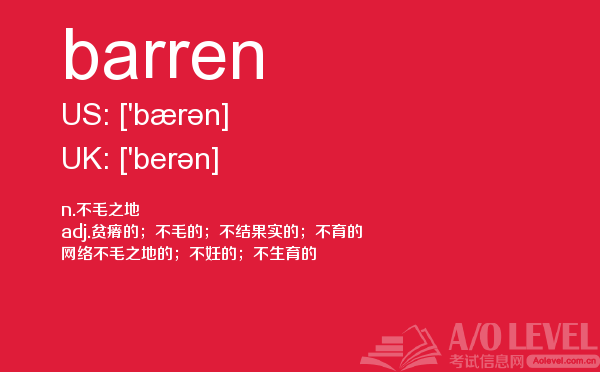 英国、加拿大、爱尔兰、澳大利亚、新西兰、新加坡等英语国家没有统一的大学入学标准,虽然它们都认可a-level证书,但是各所大学、各个专业对学生学过哪几门a-level课程以及成绩都有不同的要求。所以怎样选择课程并没有一个唯一的答案。对于如何选课的问题要根据具体情况而定。这些在你的a-level考试中都不是重要的,重要的是a-level成绩,a-level成绩取决于a-level词汇量,那么今天小编给大家带来a-level考试重点词汇barren的全面解析。如果您想了解新加坡a水准考试条件,alevel课程的劣势,alevel试题,国内知名alevel培训等关于a-level考试的相关资讯,请继续浏览并关注课窝a/o-level考试网。