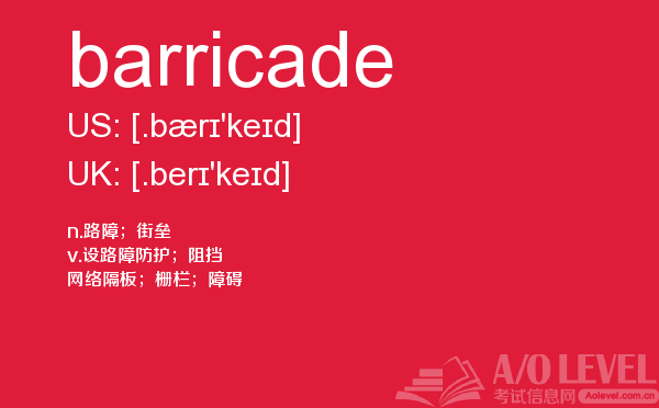英国留学对于留学成绩的比拼越来越激烈,申请英国院校留学的一大指标a-level考试分数要求也水涨船高.虽然成绩只是申请的一部分,但不得不说,好看的英国a-level成绩是学生是否优秀的证据。放松一下跟着a/o-level考试网来学习一下a-level考试词汇barricade的应用。如果您想了解alevel考试局比较,alevel课程物理,alevel真题搜索,alevel成绩网上查询等关于a-level考试的相关资讯,请继续浏览并关注课窝a/o-level考试网。