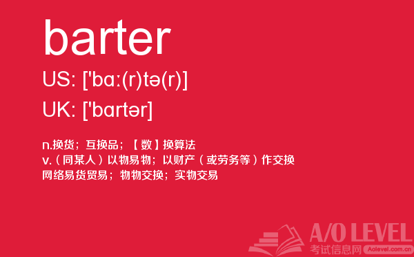 a-level的成绩分为a、b、c、d、e、u六个等级,a为最优,e为通过,u为不及格。如果学生对某门课的成绩不满意,可以选择重考,最终成绩以最好的一次为准。那么a-level考试想要取得a-level高分大家需要做到哪些呢?a/o-level考试网给大家带来的很多a-level考试经验,alevel考试技巧等等,想要考好a-level考试,不仅要知道这些,对于关于a-level考试的所有资讯都需要了解,最重点的是a-level词汇量的积累,今天a/o-level考试网就给大家带来的a-level的考试单词barter的全面解析。如果您想了解alevel化学提纲,alevel经济学问题,alevel真题试卷,怎么去英国读alevel课程等关于a-level考试的相关资讯,请继续浏览并关注课窝a/o-level考试网。