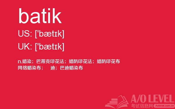 英国a-level学校,从教学质量上来看私立学校更占优势,大部分中国留学生也选择私立学校来读,不过一般都是提前一年来申请学校。中国目前也有20几所a-level学校,每年也同样有走进剑桥牛津等世界顶级大学的学生。所以在国外和在国内都可以选择a-level学校来学习。在前面关于a-level选校的问题已经详细介绍过,那么今天a/o-level考试网小编主要想介绍的是a-level重难点词汇batik。希望对大家有帮助。如果您想了解英国alevel官网,alevel可以申请哪里,alevel课程辅导哪家好,高三毕业能读alevel吗等关于a-level考试的相关资讯,请继续浏览并关注课窝a/o-level考试网。