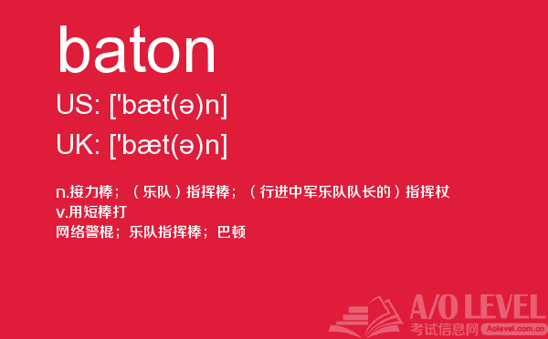 现在很多人来咨询a-level考试录取率,英国a-level考试题库的家长也依然不减,而考生们则更关心a-level教材以及a-level考试培训课程是什么样的。a/o-level考试网都会解答您。今天小编带来a/o-level考试网的内容是关于a-level词汇的baton单词的详细介绍。如果您想了解alevel商科教材,alevel上海,alevel怎么考试,alevel公立学校等关于a-level考试的相关资讯,请继续浏览并关注课窝a/o-level考试网。