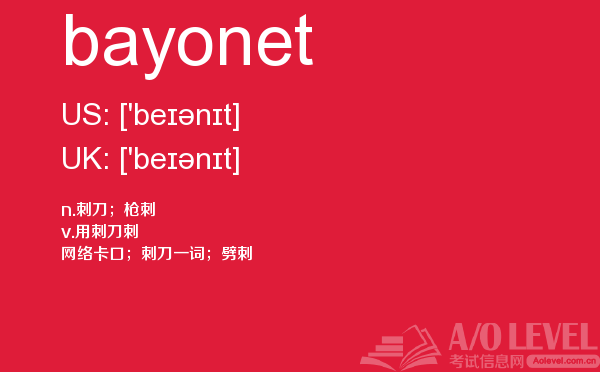 a-level考试报名须知是必须要懂得,这样在面对英国a-level入学考试的时候自己也知道应该怎么面对。为了提高考生们的a-level模拟考卷成绩,a/o-level考试网会经常给大家带来a-level考试资讯,下面就是今天课窝a/o-level考试网小编给大家讲解关于a-level考试词汇bayonet怎么用。如果您想了解牛津大学alevel,上海alevel国际学校,alevel数学评分标准,alevel考试大纲等关于a-level考试的相关资讯,请继续浏览并关注课窝a/o-level考试网。