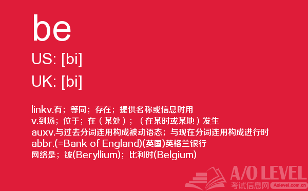 英国a-level入学考试的机会真的很少,每年就5-6月和10-11月两场考试。所以千万别因为不必要的原因,影响了a-level入学考试。为了让大家更好的在英国留学,a/o-level考试网会为大家带来a-level考试相关的资讯,一起来看看a/o-level考试网今天带来的词汇be的解析。如果您想了解alevel网课,alevel官网,alevel培训费用,alevel化学知识点整理等关于a-level考试的相关资讯,请继续浏览并关注课窝a/o-level考试网。