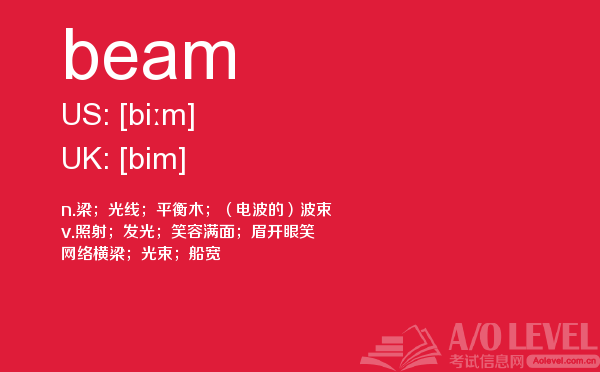 随著学生的素质提升,各大a-level课程培训班的师资和英国a-level题库也不断的完善,近年来学生考出来a-level分数也不断上涨。但是去英国留学,对英国留学资讯和英国的a-level考试资讯都是需要了解的,下面一起跟着a/o-level考试网来看看a-level词汇之beam的详细介绍。如果您想了解alevel怎么自学,a水准数学,alevel考试指南,alevel自学选什么等关于a-level考试的相关资讯,请继续浏览并关注课窝a/o-level考试网。