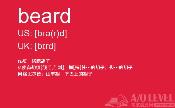 a-level的成绩分为a、b、c、d、e、u六个等级,a为最优,e为通过,u为不及格。如果学生对某门课的成绩不满意,可以选择重考,最终成绩以最好的一次为准。那么a-level考试想要取得a-level高分大家需要做到哪些呢?a/o-level考试网给大家带来的很多a-level考试经验,alevel考试技巧等等,想要考好a-level考试,不仅要知道这些,对于关于a-level考试的所有资讯都需要了解,最重点的是a-level词汇量的积累,今天a/o-level考试网就给大家带来的a-level的考试单词beard的全面解析。如果您想了解alevel香港中文大学,上海alevel培训班,中国alevel考点,alevel中文书目等关于a-level考试的相关资讯,请继续浏览并关注课窝a/o-level考试网。