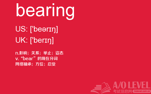对于a-level考试,我们一再强调要加强a-level考试真题实战,多做英国a-level考试真题。放松一下,跟着a/o-level考试网来积累一下a-level考试中你会用到的单词bearing,对你的a-level考试会有很大的帮助。如果您想了解alevel考试报名费,英国alevel,alevel物理考a难吗,国内学alevel要多少钱等关于a-level考试的相关资讯,请继续浏览并关注课窝a/o-level考试网。