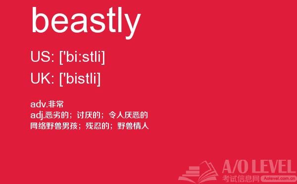现在申请英国院校的中国孩子非常多,几乎每一个学生都在为一种叫做英国a-level的考试而努力着。a/o-level考试网老师为大家解析a-level考试重难点单词beastly,大家认真学习,会有帮助。如果您想了解alevel价格,alevel数学教科书,国内alevel学校,alevel报名截止日期等关于a-level考试的相关资讯,请继续浏览并关注课窝a/o-level考试网。