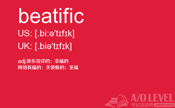 虽然英国a-level院校招生官常把“成绩不是决定录取与否的唯一因素”挂在嘴边,但不得不承认,a-level分数是学生优秀与否的有力证据,取得a-level成绩高分是肯定是优先考虑的。放松一下,先跟着a/o-level考试网来看看今天小编带来的是a-level单词beatific的介绍。如果您想了解alevel是什么意思,alevel课程怎么申请,alevel自学考几门,在线alevel辅导等关于a-level考试的相关资讯,请继续浏览并关注课窝a/o-level考试网。