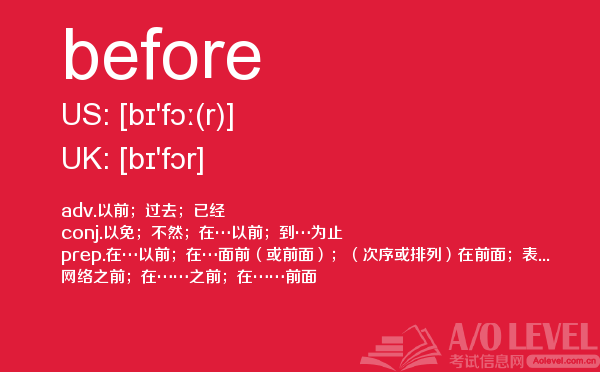 英国留学对于留学成绩的比拼越来越激烈,申请英国院校留学的一大指标a-level考试分数要求也水涨船高.虽然成绩只是申请的一部分,但不得不说,好看的英国a-level成绩是学生是否优秀的证据。放松一下跟着a/o-level考试网来学习一下a-level考试词汇before的应用。如果您想了解英国高中alevel排名,alevel国际高中,alevel学费一般多少,alevel会计学等关于a-level考试的相关资讯,请继续浏览并关注课窝a/o-level考试网。
