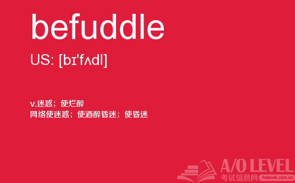 目前,a/olevel逐渐为人所熟知,很多学生都会主动了解alevel考试流程。同时也会抱怨a-level英语题比较难,任务重。那现在我们就放松一下,跟着a/o-level考试网小编来看看a-level考试中要积累的单词befuddle,认真的学习积累。如果您想了解alevel国际班,alevel入学考试,alevel考试地点,alevel考试辅导等关于a-level考试的相关资讯,请继续浏览并关注课窝a/o-level考试网。