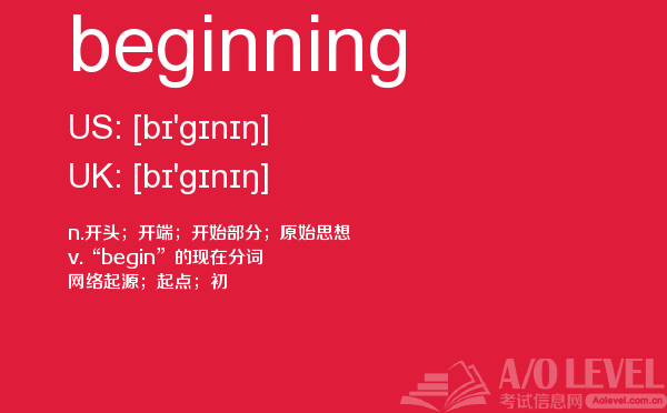 英国a-level考试报名费很好解决,那怎样才能达到a-level考试词汇量要求呢?别再纠结于a-level考试分数要求了,今天我们来一起看看a/o-level考试网今天带给你的a-level单词beginning的讲解。如果您想了解alevel物理测试题,南京alevel培训机构,alevel商科教材,上海alevel学校排名等关于a-level考试的相关资讯,请继续浏览并关注课窝a/o-level考试网。