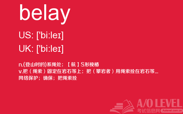 a-level词汇量受到的关注越来越高,很多家长担心a-level考试培训费用,a-level考试录取竞争会不会越来越激烈?这些问题在课窝a/o-level考试网小编都会给大家带来详细介绍,今天a/o-level考试网小编给大家带来的是在a-level考试中的重点词汇belay的详细介绍。如果您想了解alevel化学难不难,alevel生物,香港中文大学alevel,alevel报名流程等关于a-level考试的相关资讯,请继续浏览并关注课窝a/o-level考试网。