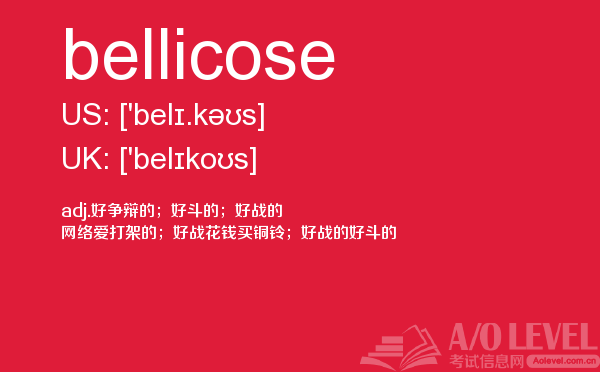 现在很多人来咨询a-level考试录取率,英国a-level考试题库的家长也依然不减,而考生们则更关心a-level教材以及a-level考试培训课程是什么样的。a/o-level考试网都会解答您。今天小编带来a/o-level考试网的内容是关于a-level词汇的bellicose单词的详细介绍。如果您想了解牛津大学alevel,上海alevel国际学校,alevel数学评分标准,alevel考试大纲等关于a-level考试的相关资讯,请继续浏览并关注课窝a/o-level考试网。