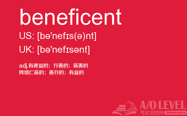 虽然英国a-level院校招生官常把“成绩不是决定录取与否的唯一因素”挂在嘴边,但不得不承认,a-level分数是学生优秀与否的有力证据,取得a-level成绩高分是肯定是优先考虑的。放松一下,先跟着a/o-level考试网来看看今天小编带来的是a-level单词beneficent的介绍。如果您想了解alevel中文口语,alevel社会学,a水准一年,新加坡最好的a水准预科学校等关于a-level考试的相关资讯,请继续浏览并关注课窝a/o-level考试网。